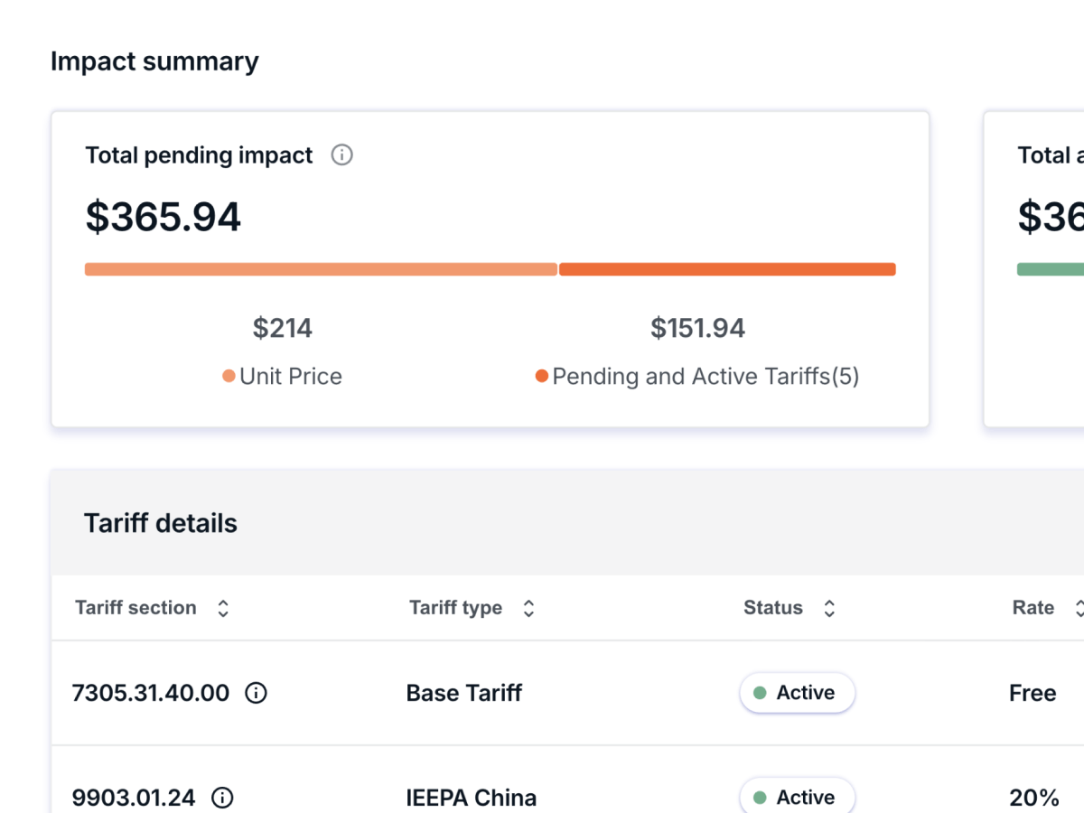 即时了解产品目录和供应商网络的关税成本。 比较供应商、分析历史趋势,并快速响应贸易变化。
