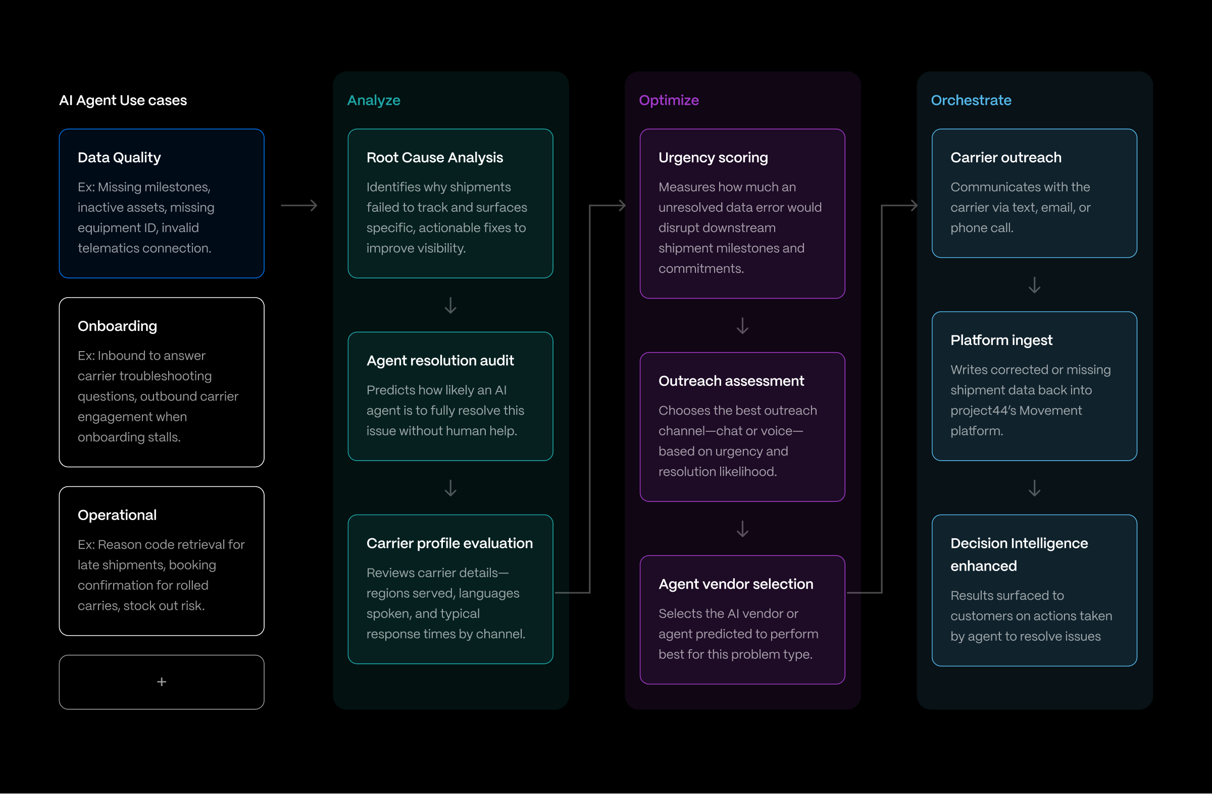 我们的代理不仅仅执行单个操作,如联系承运商、重新安排货运路线或重新预订货运。 project44 的分析、优化、协调框架使用情境和智能为正确的用例选择合适的代理,以提供最佳的结果。 这种集成方法形成了一个连续的循环,没有单一用途的代理能够单独实现这一目标。